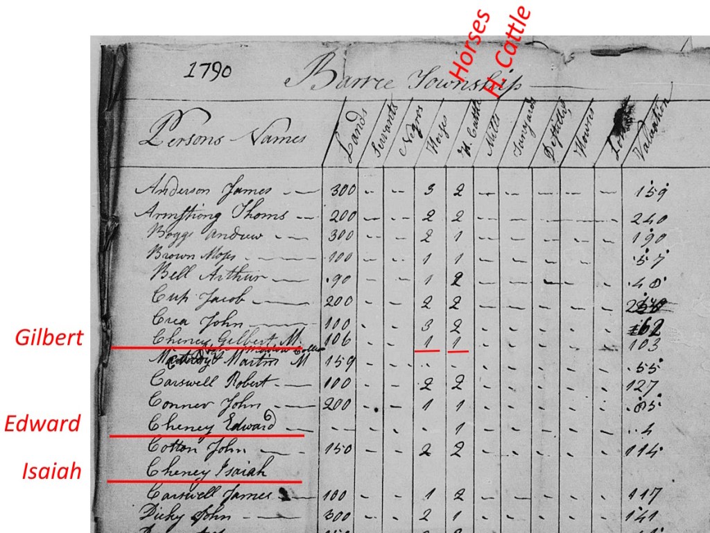 The census reports that Gilbert has one horse and one cow (horned cattle). Edward Cheney has one horse, and Isaiah has none.