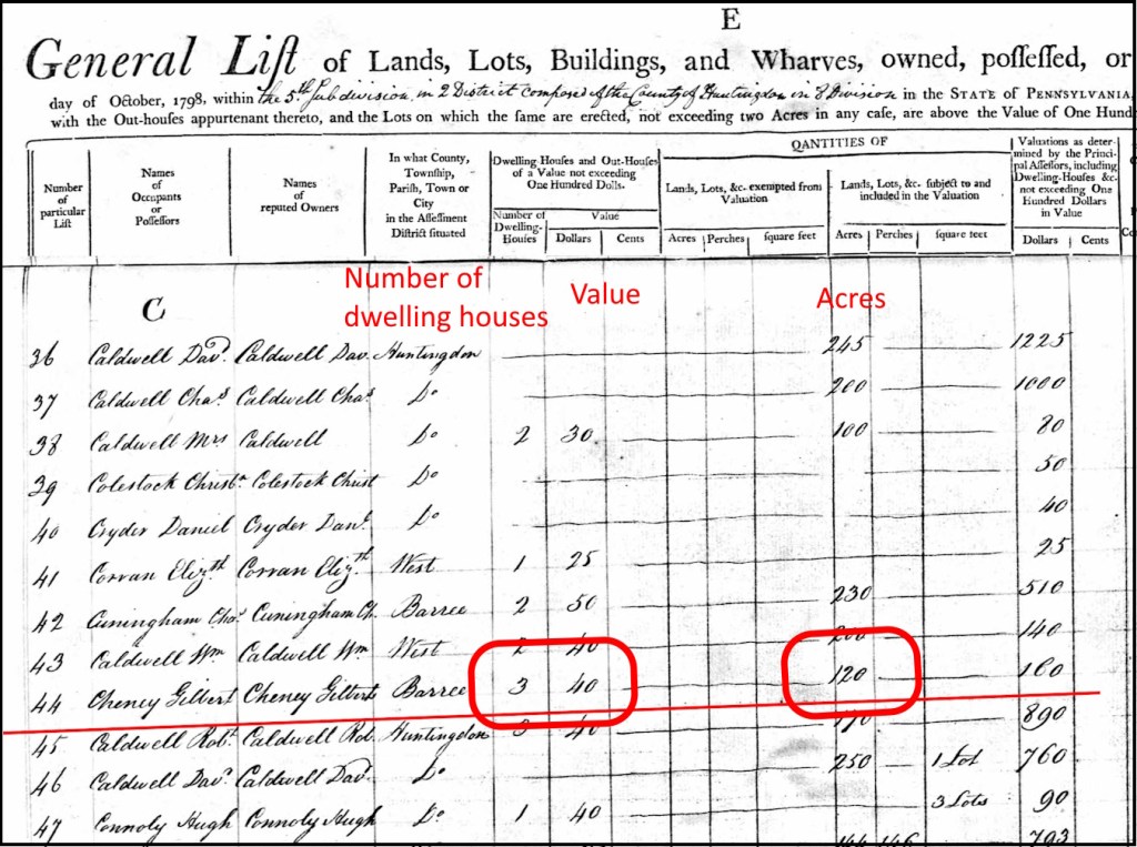 - Image – Pennsylvania, U.S., U.S. Direct Tax Lists, 1798 for Gilbert Cheney – Ancestry.com – https://www.ancestry.com/search/collections/2060/records/335652?tid=4491114&pid=-257124079&ssrc=pt