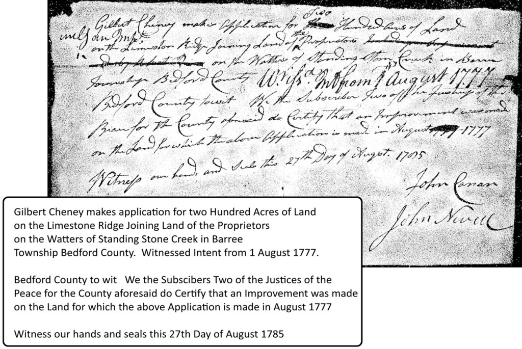 In 1787, Huntingdon County was formed from Bedford County. Gilbert Cheney had applied for a land warrant for his land in Bedford County, but the survey was now being done on his land in Huntingdon County. The Cheneys were now residents of Huntingdon County.