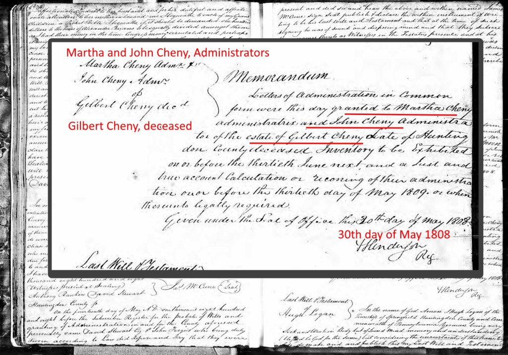 - Image – Letter of Administration granted to Martha and John Cheney in the estate of Gilbert Cheney – Pennsylvania, Land Warrants and Applications, 1733-1952 – Ancestry.com – https://www.ancestry.com/search/collections/2350/records/222682?tid=4491114&pid=-257124079&ssrc=pt