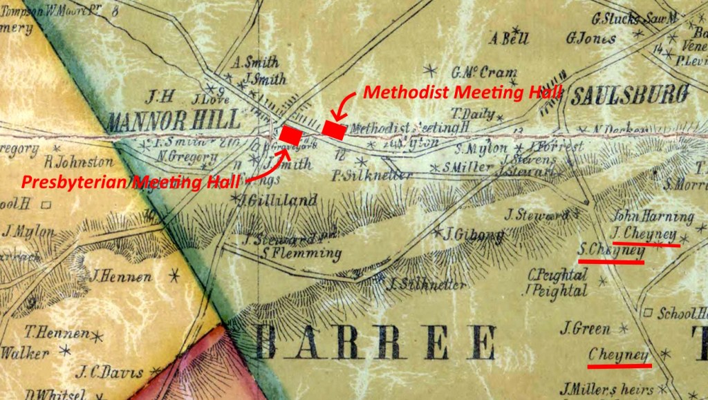 Here are both meeting houses on an 1856 map of Barree Township. They’re both close to the Cheney households.