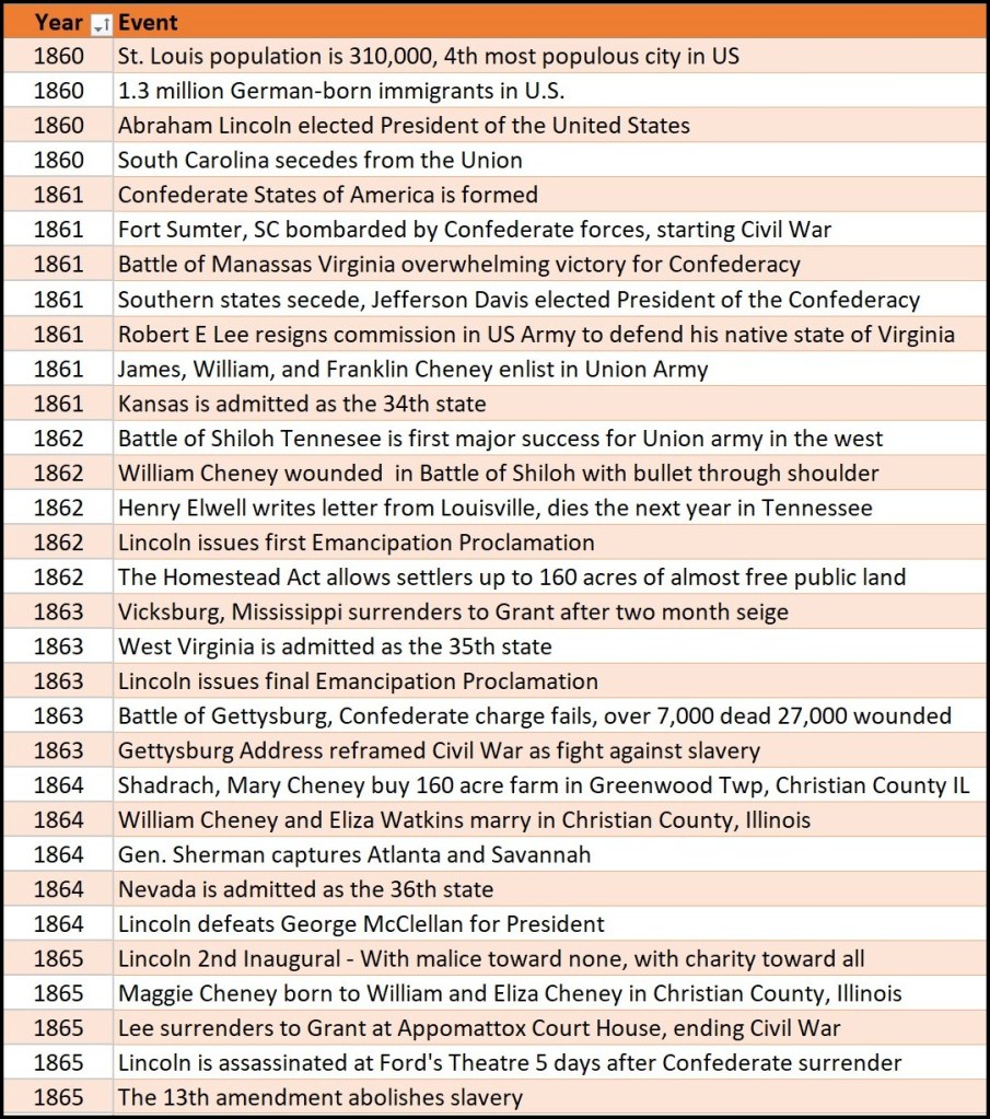 In November 1860, just a few months after the Cheneys arrived in Christian County, Abraham Lincoln from neighboring Sangamon County, Illinois was elected president. That caused seven Southern states to secede from the Union. They formed the Confederate States of America.