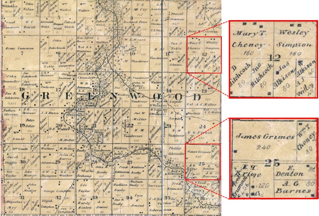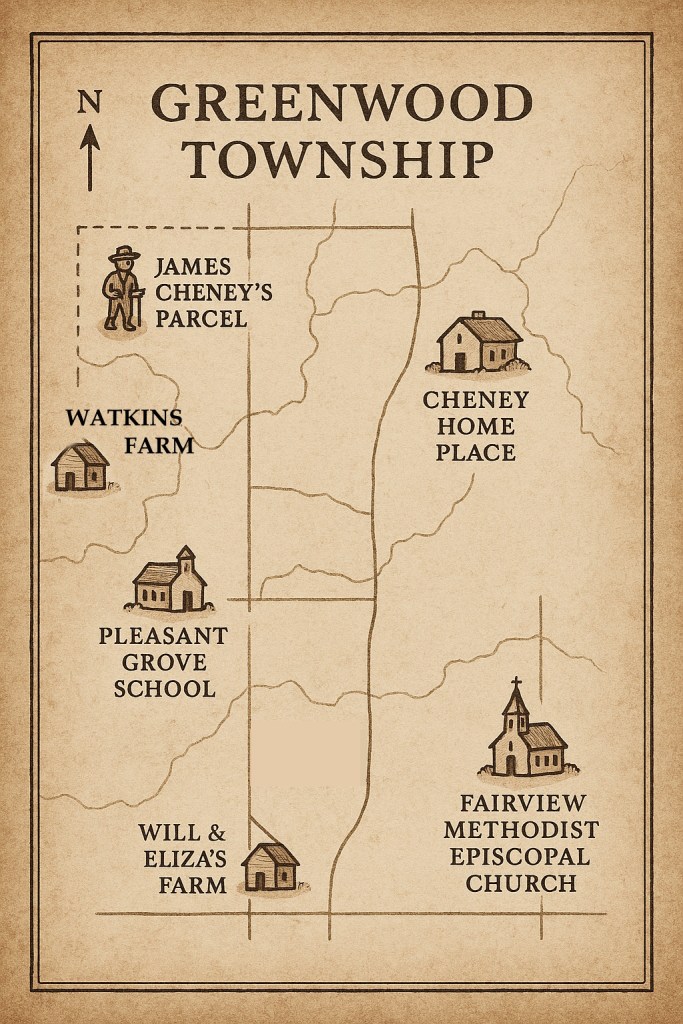 The farm was located in Section 25 of Greenwood Township, just three miles south of the Cheney “home place.” So Will Cheney was close to his mother Mary, brother James, and sister Sarah, as well as younger siblings still at home Margaret, Franklin, John, and Charles.