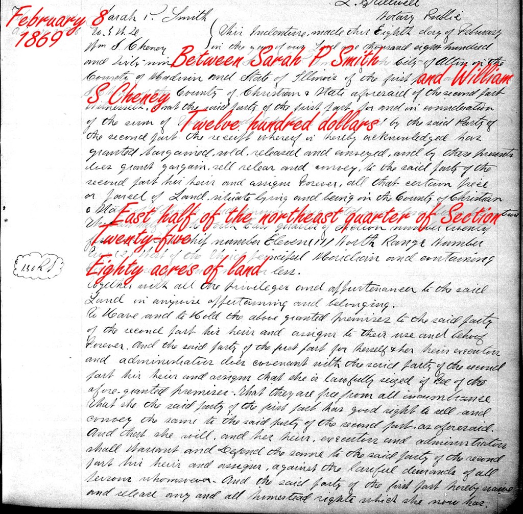 - Deed – William Cheney from Sarah Smith – E Half of NE Qty Sec 25 Twp 11N Range 2W Christian Co IL Book 39 Page 370 – 1869 – FamilySearch – https://www.familysearch.org/ark:/61903/3:1:3Q9M-C3QC-6S4B-C?view=fullText&keywords=Cheney&lang=en&groupId=