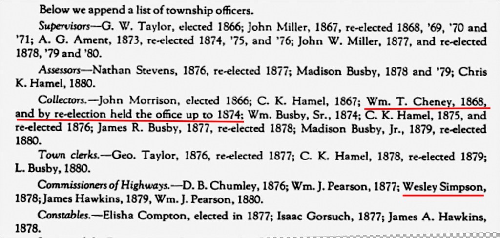 He was elected “Collector” for Greenwood Township, and re-elected for several terms from 1868 through 1874. A Township Collector collected property taxes, handled school levies, managed receipts and records, and reported to the township board. Sometimes the Collector had the authority to initiate legal proceedings to enforce payment.
