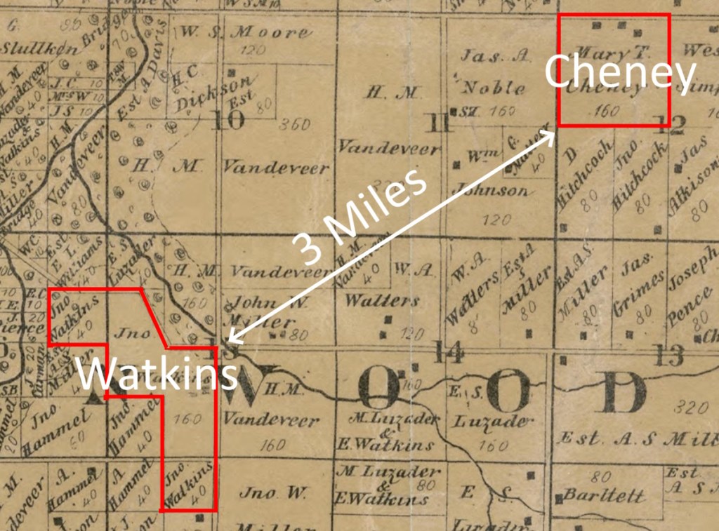 - Maps – Cheney and Watkins, Cheney home place and William Cheney – based on Map of Christian County, Illinois – Library of Congress – https://www.loc.gov/resource/g4103c.la000101/?r=0.428,0.792,0.137,0.117,0
