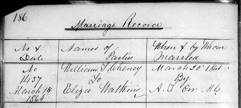 William Cheney and Eliza Watkins were married on Sunday, March 20, 1864. They’re our 3rd great grandparents.