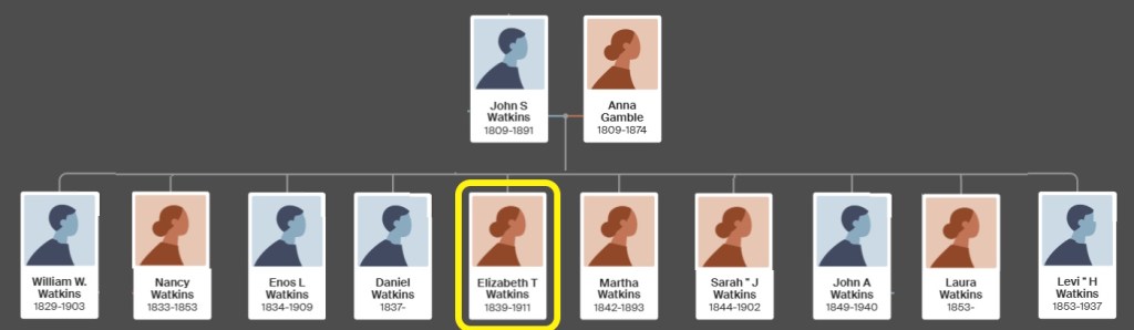 Elizabeth T Watkins, our 3rd great grandmother, was born November 29, 1839, in Leesburg, Carroll County, Ohio. Her parents, John S Watkins and Anna Gamble, are our 4th great grandparents.