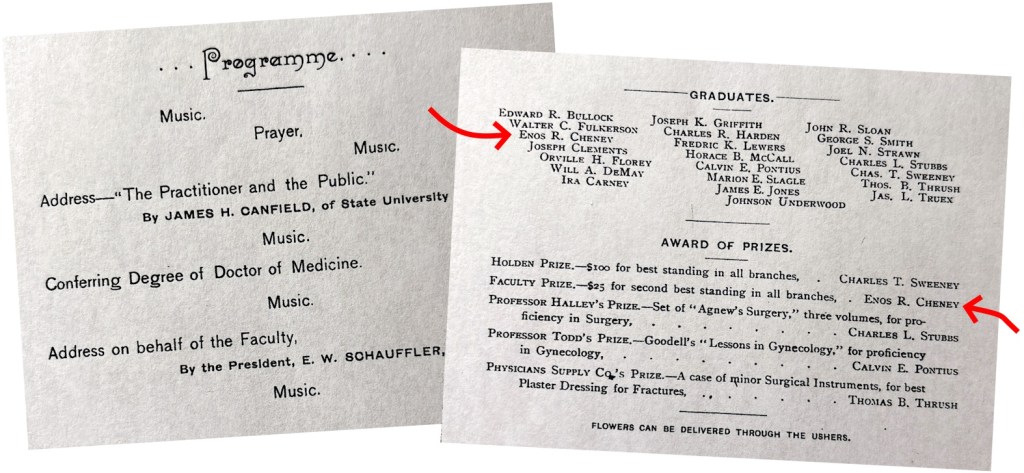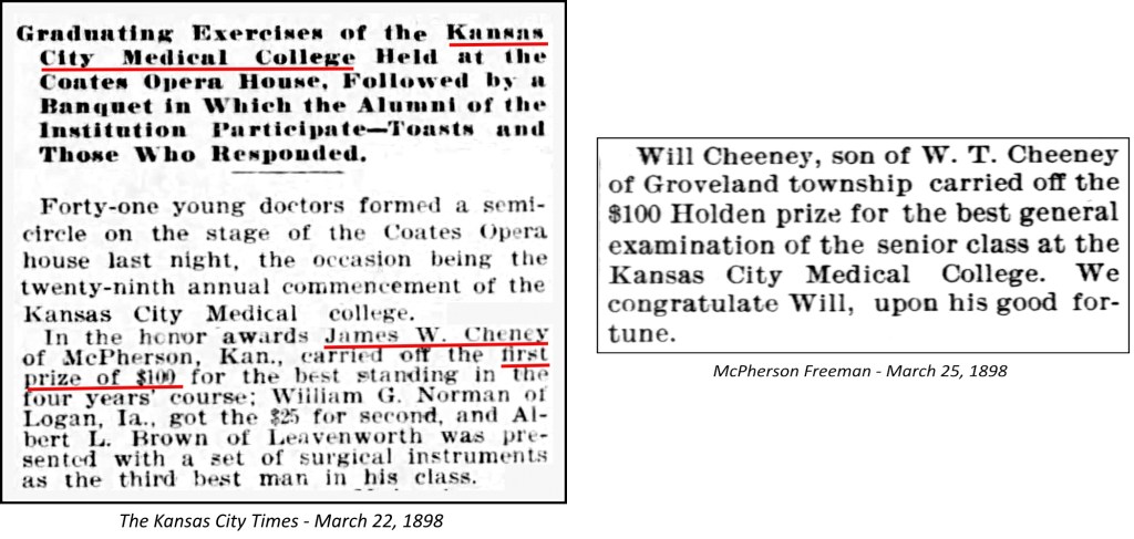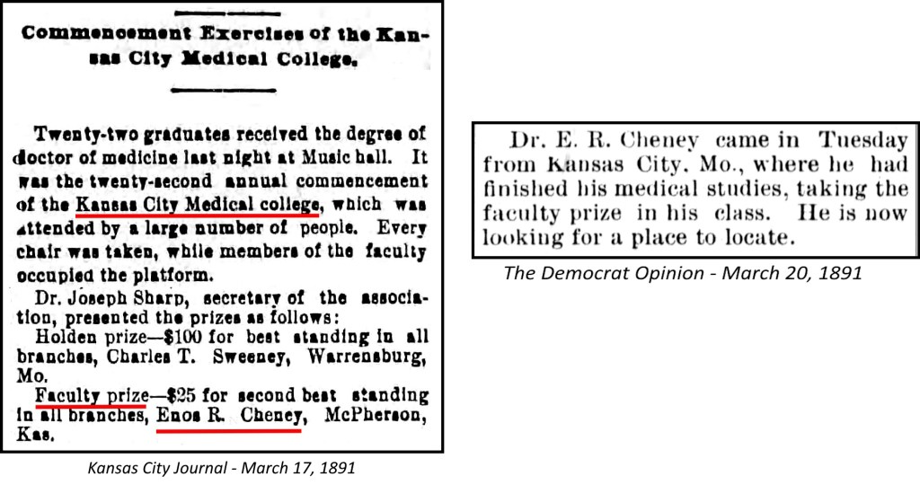 After graduation from McPherson High School, Enos Cheney enrolled in the Kansas City Medical College in 1888. Enos is our 2nd great-grandfather.