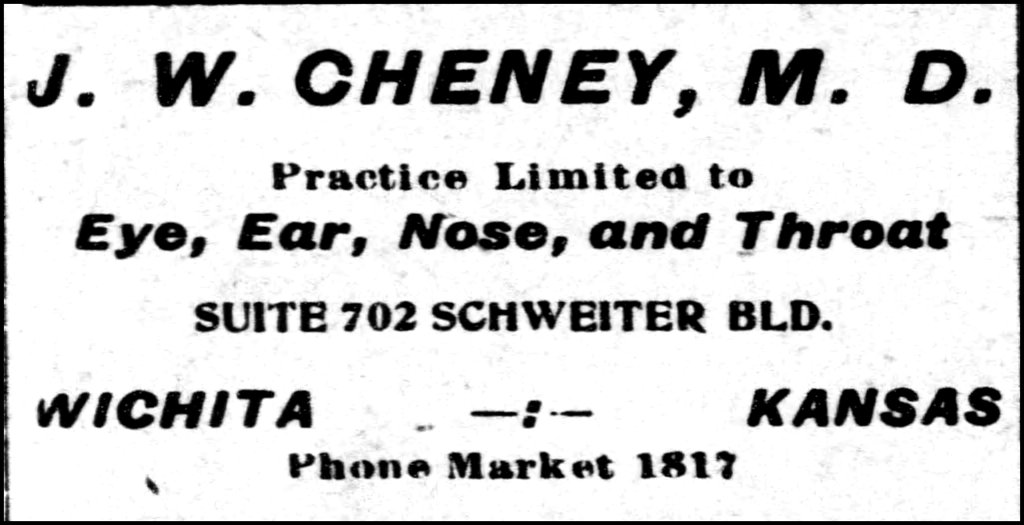 In 1910, J.W. Cheney spent a year in Vienna, Austria for additional training to become a specialist in Eye, Ear, Nose, and Throat (EENT). He moved his practice to Wichita, Kansas in 1911, where he was on the board of the Wichita Hospital.