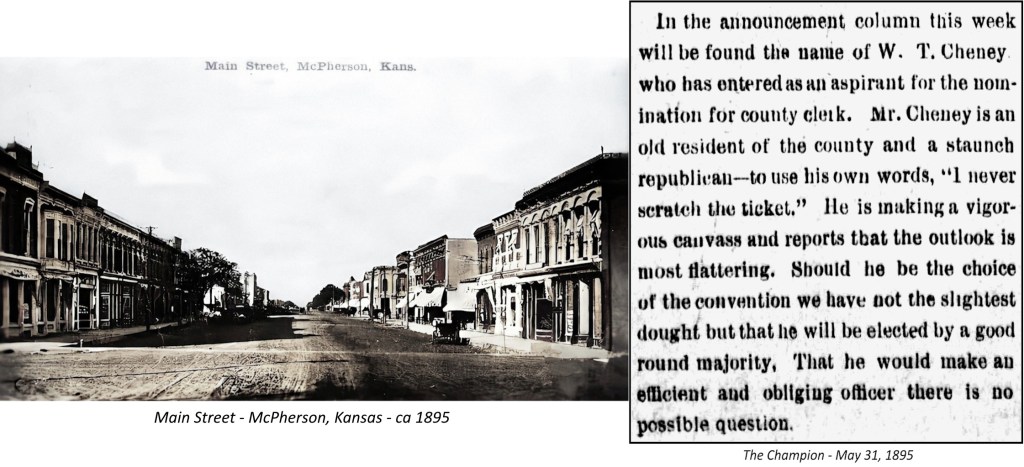 William Cheney had been active in local politics for many years. In 1895, he threw his hat in the ring for McPherson County Clerk.