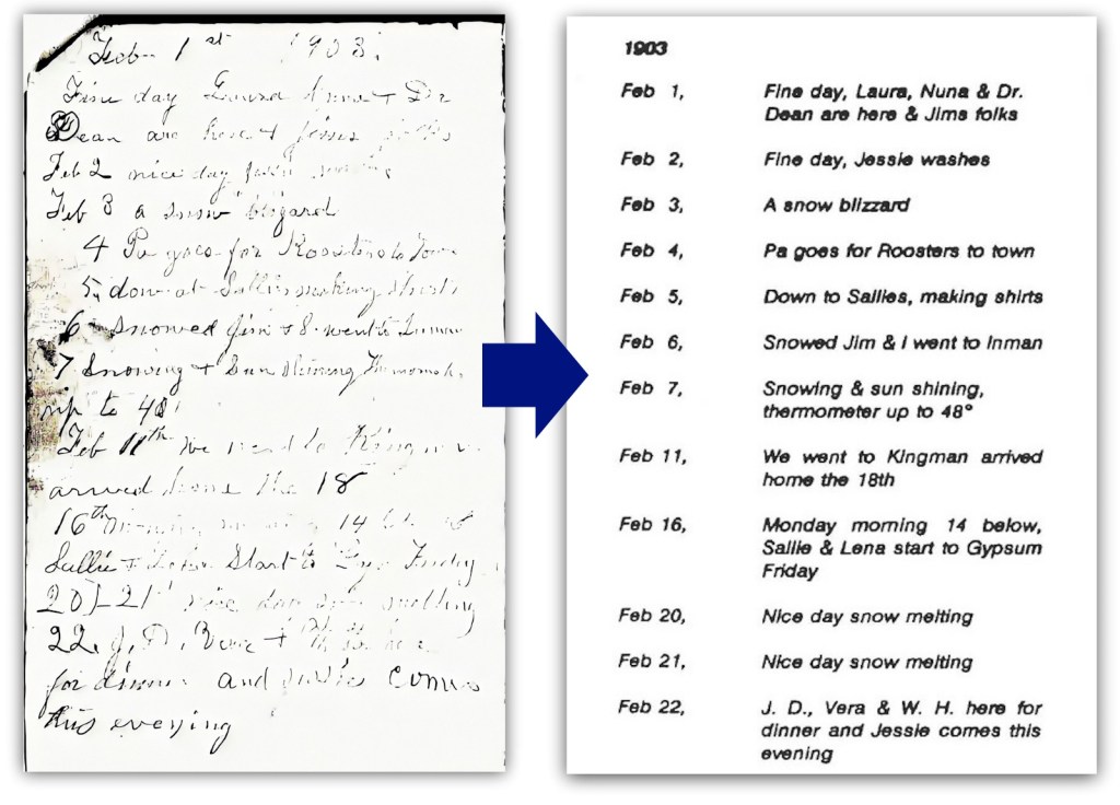 - Record Cold (Feb 13, 1905): The coldest recorded temperature in the diary; “24° below zero at 6:00 AM.”