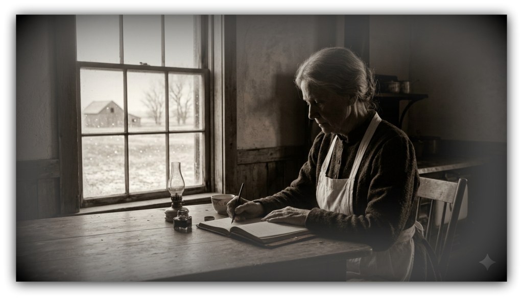 - Image – Woman writing diary at kitchen table – AI generated – Google Gemini