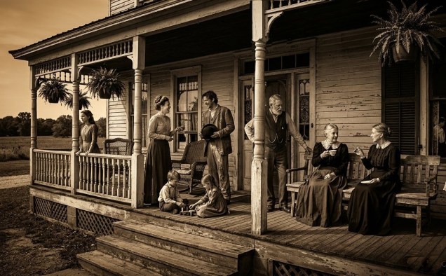 - Images – Two women doing farm chores, Storm clouds over Kansas farm, Porch party, Patient and healer, Family portrait, Farm neighborhood – AI generated – Google Gemini