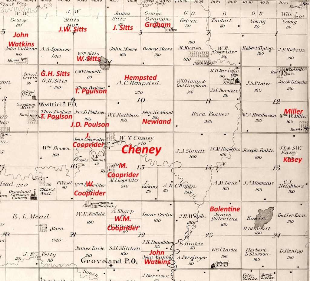 - Map – Cheney neighborhood in Groveland Township, McPherson County, Kansas – Plat Book of McPherson County Kansas – North West Publishing Co. – Minneapolis, Minnesota 1903 – McPherson Public Library – https://macpl.org/map-room/plat-book/