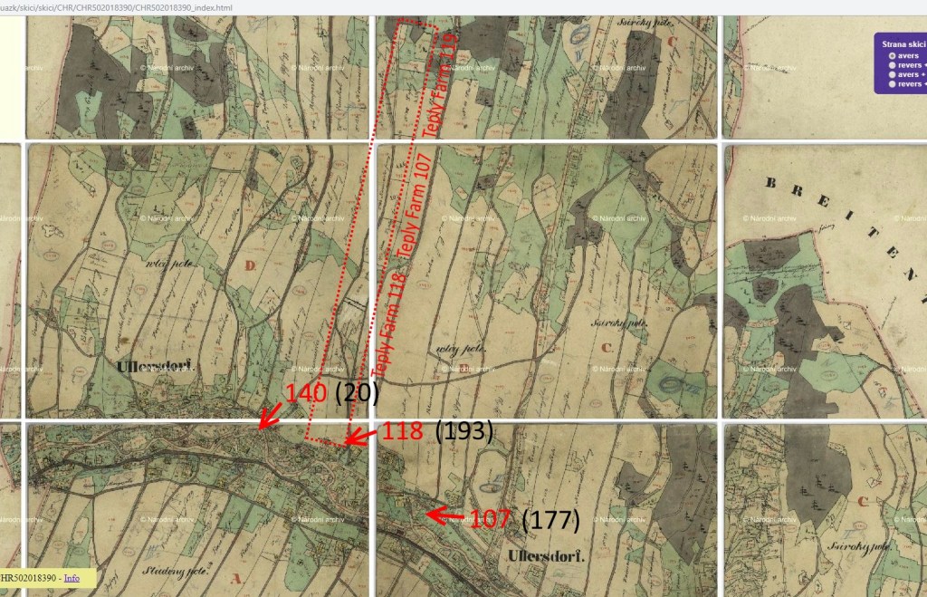 Each house was shown and numbered. Each field and garden was indicated. Many fields displayed the farmer’s name. The maps were hand painted. Here’s an example of those maps showing the Teply houses and farms in Oldřiš and Borová.