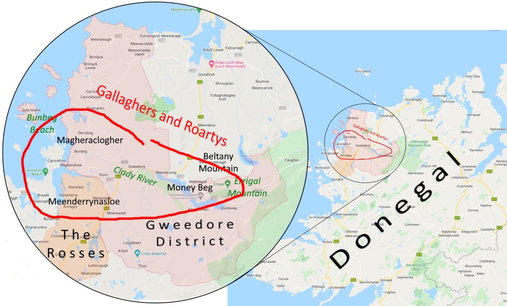 Continue readingWe found the Gallaghers, Roartys, Dugans, and Duffys in Meenderrynasloe and surrounding townlands. These townlands are in The Rosses and Gweedore Districts.