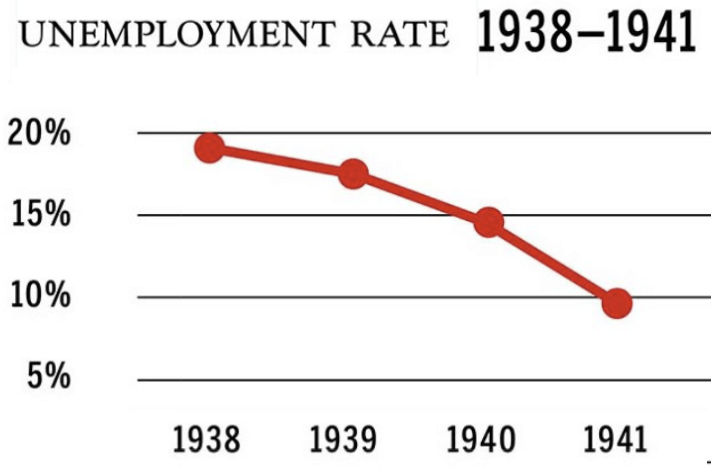 In 1941 unemployment would drop below 10 percent for the first time since 1930.